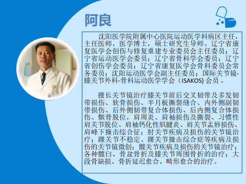 阿良主任是医学博士、主任医师、硕士研究生导师,同时担任辽宁省康复医学会创伤与修复重建专业委员会主任委员、辽宁省运动医学会委员、辽宁省骨科学会委员、辽宁省创伤学会委员、辽宁省康复医学会骨科委员会常务委员、沈阳运动医学会副主任委员,以及国际关节镜-膝关节外科-骨科运动医学学会(ISAKOS)会员。