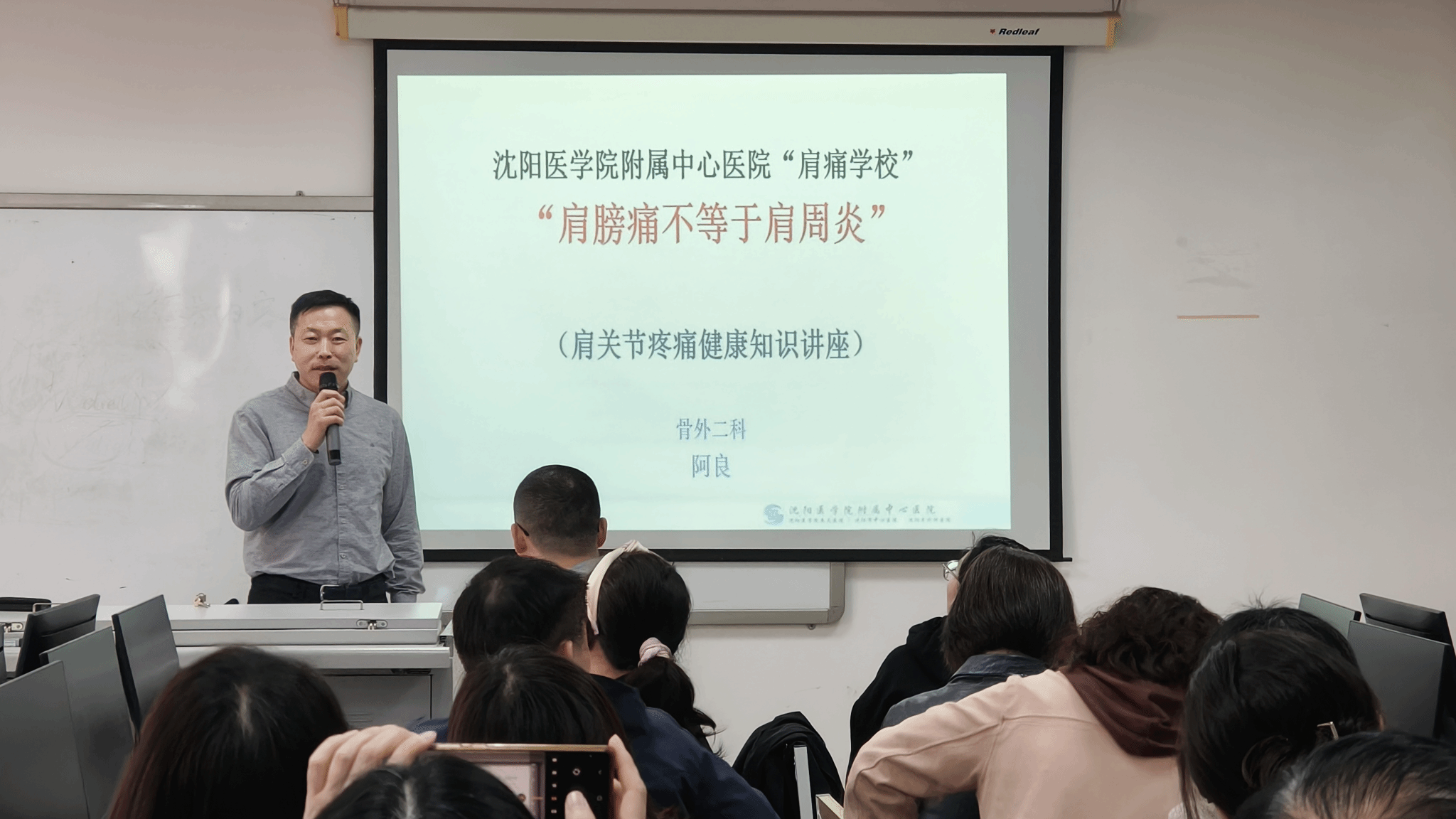 本次讲座主题为“肩关节疼痛健康知识讲座”,旨在提升学院教职工对运动医学领域的认知,促进医学信息工程与临床医学的深度融合。阿良主任从肩关节常见疾病、诊疗技术以及康复治疗等方面进行了深入浅出的讲解,并结合实际案例分享了宝贵的临床经验。讲座最后,阿良主任还与教师们进行了互动交流,耐心解答了大家提出的问题。教师们纷纷表示受益良多。