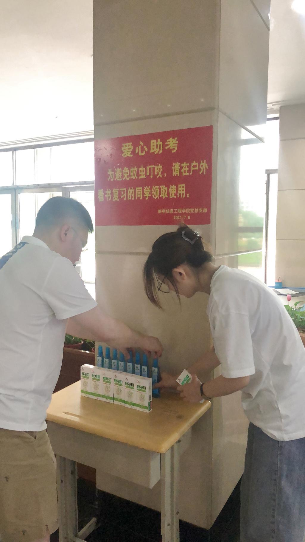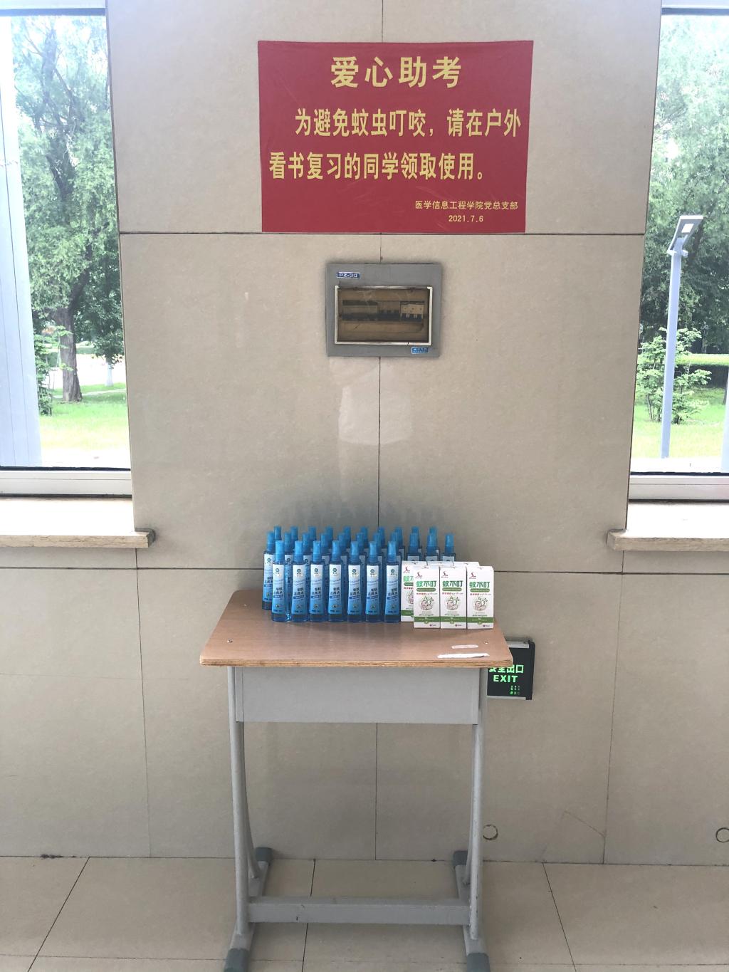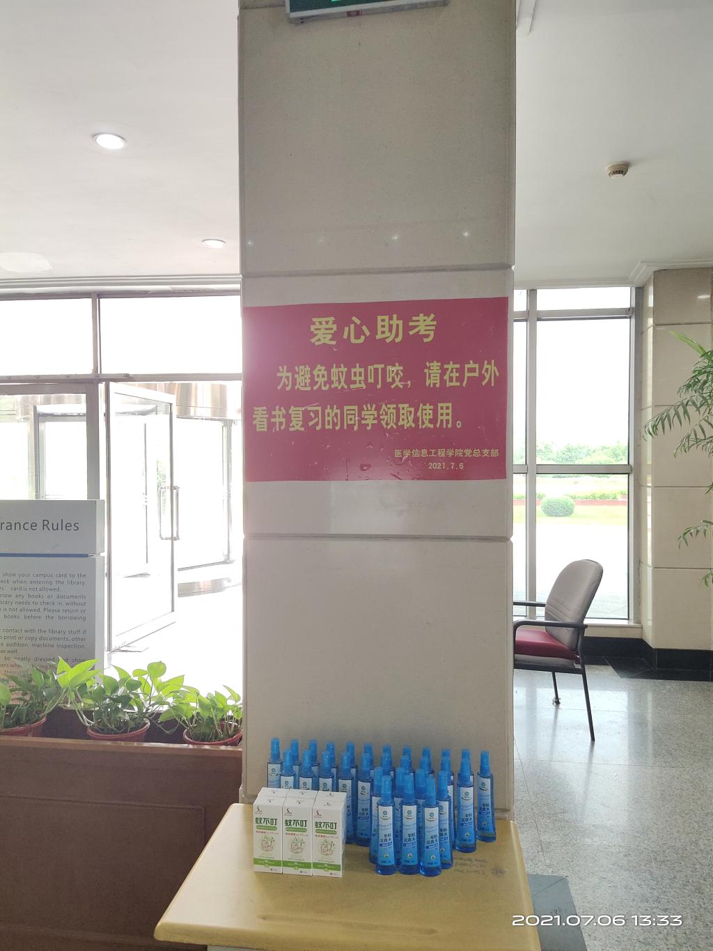 为了帮助期末备考的学生更好地复习,ac米兰官方网站党总支部继续开展“践行初心,爱心助考”活动,7月6日,为在户外看书的同学们提供便携式驱蚊花露水,分别放置在致远楼一楼、图书馆一楼大厅,方便学生领取使用。