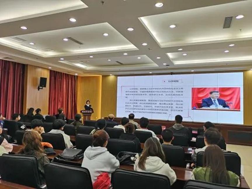沈阳工业大学马克思主义教育学院孟佳琳老师首先向与会师生阐述了党的二十大精神主要内涵,接着围绕“以学铸魂 坚定理想信念”展开讲解,从为何学、怎样学、学什么三个方面为在场师生解读了学习贯彻习近平新时代中国特色社会主义思想主题教育工作会议的内容。