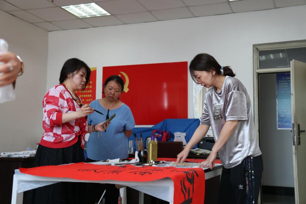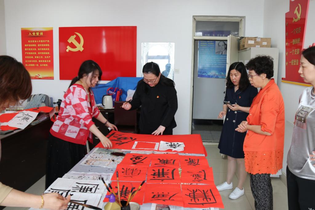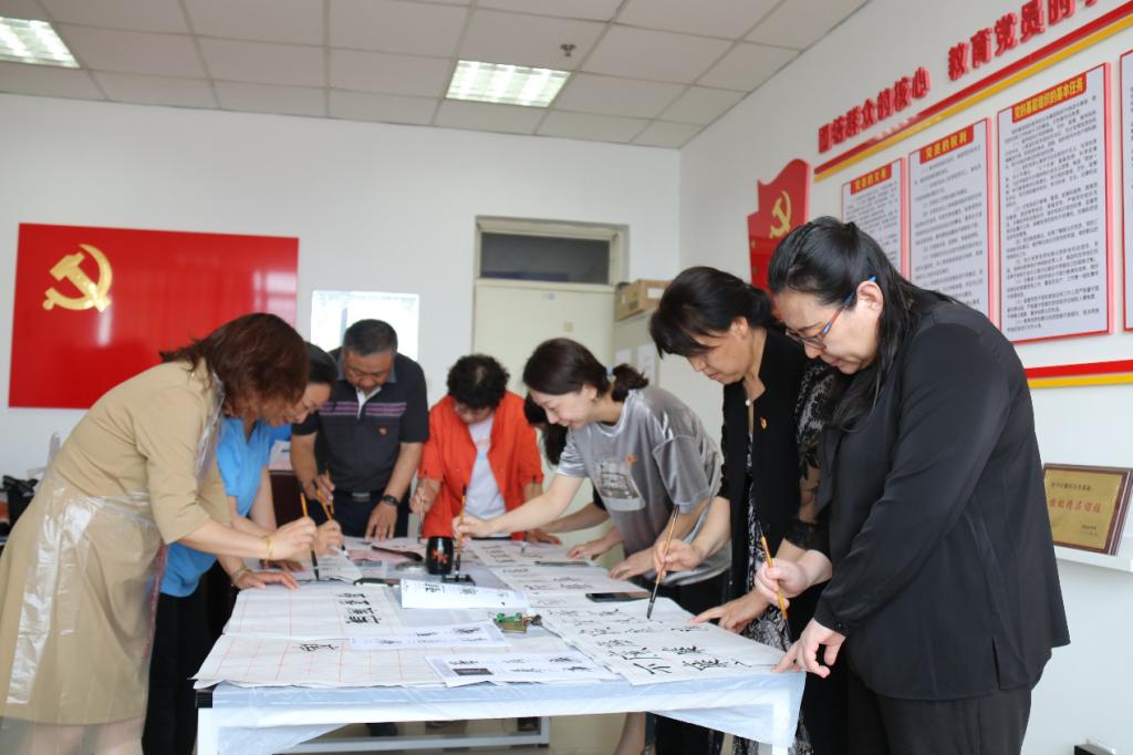 王杨老师在洒金的红纸上主笔书写”奋斗“二字,其他党员分别书写了9个不同字体的“廉“字,最后组成了一幅书法作品《廉——百年奋斗》。